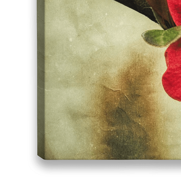 Drie rode bloemen op een tak als centraal element van de foto tegen een getextureerde achtergrond.