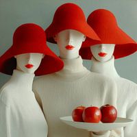 Een artistiek portret van drie gestileerde etalagepoppen met een opvallende rode hoed die scherp contrasteert met hun zachte gelaatstrekken. Hun gezichtsuitdrukkingen zijn sereen en introspectief, met opvallende rode lippen die de aandacht trekken. Ze zijn gekleed in een gladde, beige coltrui die een minimalistische toets aan de compositie toevoegt. De algehele stijl roept een gevoel van surrealisme en harmonie op.