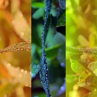 Montage photographique de macro-photographies de rosée sur des herbes. Traitement chromatique.