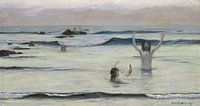 'Tritons' werd in 1890 in Parijs tentoongesteld op de Oude Salon en was het eerste schilderij van een Australiër dat een eervolle vermelding kreeg. Het werk toont een groep tritons - legendarische wezens die zowel op het land als in de zee leefden - die genieten van een rustig moment in hun rustige omgeving en introduceert een aantal kenmerken die het werk van de kunstenaar zouden gaan kenmerken: een fascinatie voor mythologische onderwerpen en het afbeelden van het exotische in een intieme setting. Rupert Bunny heeft vakkundig een schemerige sfeer gecreëerd door middel van delicate kleurenschema's, waarbij het bleke blauw, de zilverkleurige oceaan en de roze lucht rustig worden weerspiegeld in de huidtinten van de figuren.