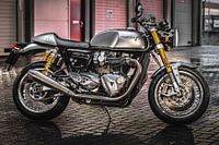 Koop dit portret Triumph Thruxton R van Westland Op Wielen als print op canvas, aluminium dibond, (ingelijste) fotoprint, behang en ArtFrame. Voor jou op maat geprint in Fine-Art kwaliteit.