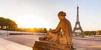 Standbeeld bij de Trocadéro en de Eiffeltoren bij zonsopgang in Parijs.
