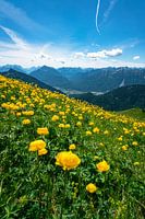 Trollenbloemenweide boven de Tannheimbergen met uitzicht op het Lechdal