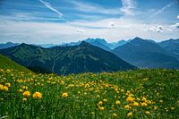 Trollenbloemenweide boven de Tannheimer bergen met uitzicht op de Zugspitze