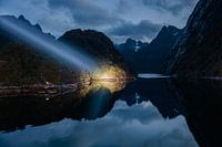 De Trollfjord bij nacht in de schijnwerpers, Noorwegen.
