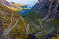 Een weids uitzicht over de de beroemde Trollstigen weg, een kronkelige bergweg in de gemeente Rauma, gelegen in de provincie Møre og Romsdal, Noorwegen.