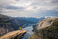 Trolltunga:  De gele man met uitzicht op Ringedalsvannet en besneeuwde Bergen van Be More Outdoor