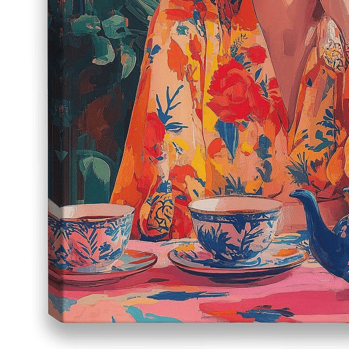 Een sfeervolle tropische setting waarin elegantie en vintage stijl samenkomen tijdens een theemoment. De compositie ademt luxe met een prachtig gedekte theetafel, versierd met traditioneel porselein in blauw en roze tinten. Het geheel wordt omlijst door weelderige palmbladeren tegen een warme oranje-roze achtergrond, wat een tijdloze…