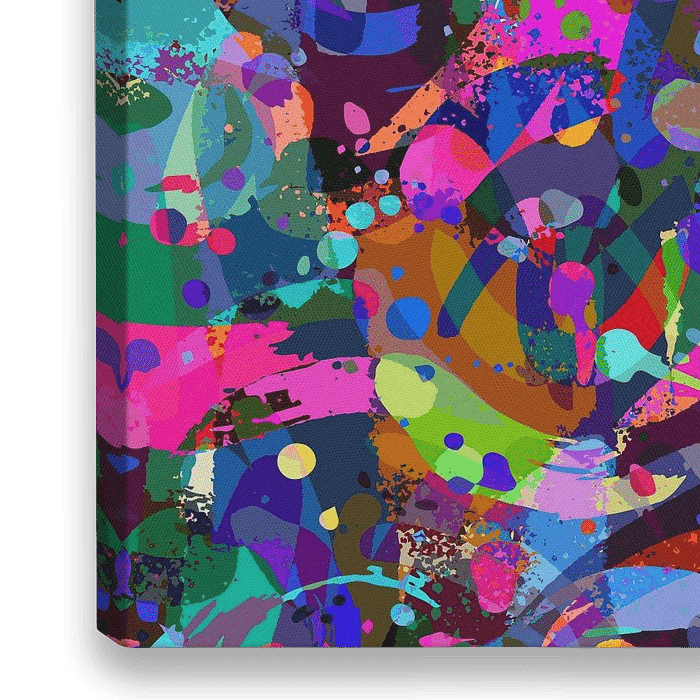 Een levendig en kleurrijk kunstwerk in de stijl van mixed media collage gevuld met verschillende vormen, verfspatten en abstracte vormen wat een energieke en dynamische compositie creëert.