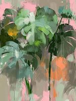 Tropical vibes, kleurrijk schilderij van tropische planten. Ook erg mooi als behang. Een echte eyecatcher voor je interieur! In groen, roze en oranje.