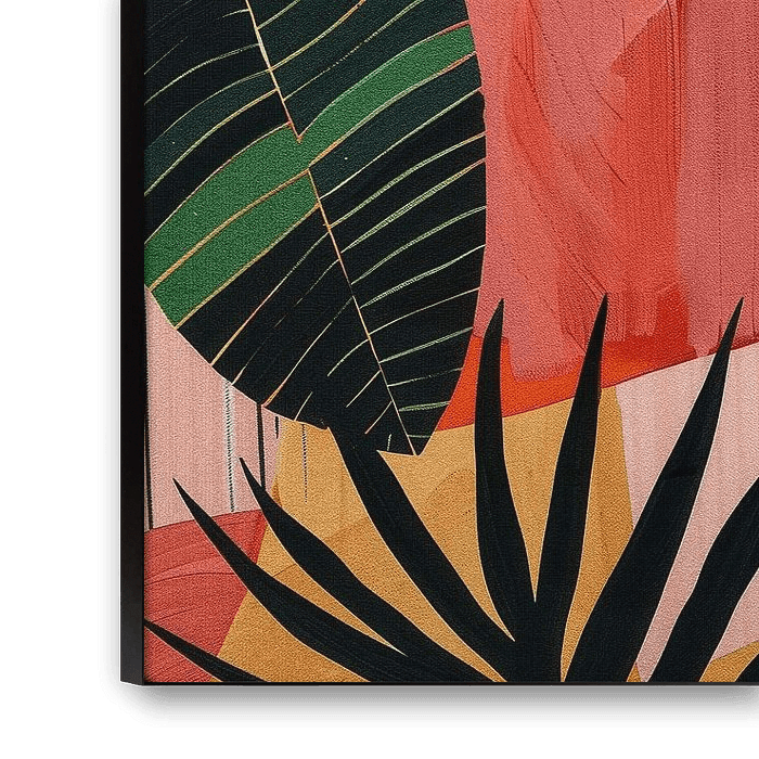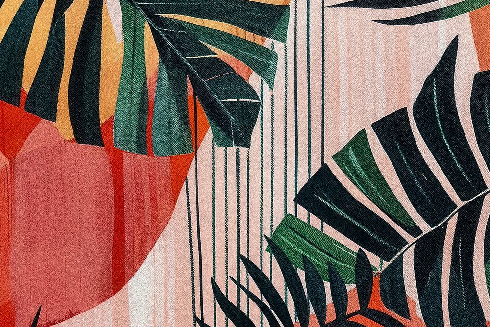 Dit werk toont een levendig patroon van tropische bladeren in rijke tinten groen, oranje en roze. De abstracte en speelse opstelling van de bladeren creëert een dynamische en energieke sfeer. De contrasten tussen de kleuren en vormen brengen een gevoel van beweging en frisheid. Dit werk zou prachtig staan in een woonkamer of eetkamer, waar het een vrolijke en exotische ambiance kan toevoegen.