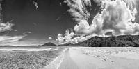 Tropisch strand in het Caribisch gebied op het Britse Maagdeneiland Tortola in zwart-wit.