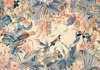 Tropische jungle met exotische papegaaien, planten en bloemen in vintage look