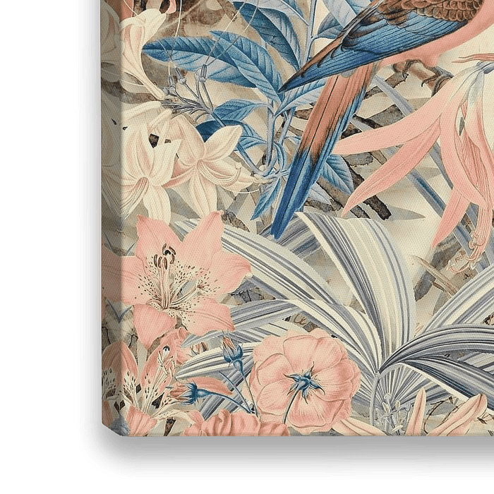 Tropische jungle met exotische papegaaien, planten en bloemen in vintage look