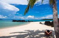 Het piepkleine eiland Koh Kahm is het ultieme paradijsje. witte stranden, azuurblauw water, palmbomen en 1 hutje waar een local uit een koelkast op z'n kant ijskoude biertjes verkoopt. Deze slapende local is met opzet in deze compositie betrokken.