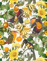 prachtige handgeschilderde antieke toekan vogels met tropische vruchten - exotische bladeren en bloemen op een witte achtergrond.