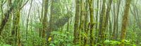 Tropisch regenwoud in Costa Rica in panorama formaat. De foto toont grillig gevormde bomen in het mistige nevelwoud van Santa Elena. De bomen zijn bedekt met groen mos en epiphyten.