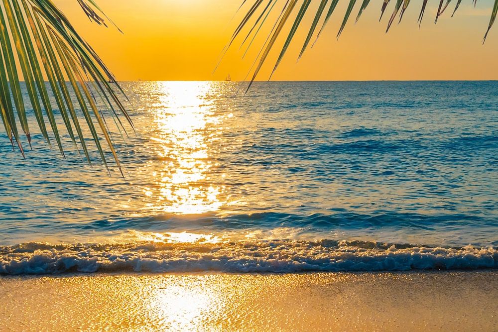 Laat je meevoeren naar een paradijselijk moment met deze kleurrijke tropische landschapsfoto. Vastgelegd in maart, toont dit beeld een idyllisch strand waar de zee zachtjes de kust raakt terwijl de zon boven de horizon staat. De warme gloed van de zonsondergang weerspiegelt op het water en kleurt de hemel in tinten van oranje en blauw. Wuivende palmboombladeren omlijsten het tafereel en versterken het gevoel van ontspanning en exotische schoonheid.