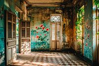 Een kamer vol tropische kleuren waar verweerde muren en beschilderde bloemen een verhaal van vergankelijkheid vertellen. Zonlicht valt zacht door de luiken en maakt dit kunstwerk een sfeervolle en nostalgische blikvanger.