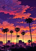 Een prachtige illustratie met de dramatische kleuren van een zonsondergang boven de skyline van een stad, gesilhouetteerd door prominente palmbomen. De lucht is een overvloed aan diepe paarse, oranje en roze tinten met wolken met textuur, die een warme, bijna dromerige, tropische stedelijke sfeer oproepen.