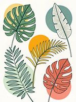 Een artistieke illustratie met een levendige verzameling gestileerde tropische bladeren, waaronder monstera-, palm- en bananenbladeren, tegen een pastelkleurige en warmgetinte cirkelvormige achtergrond. De bladeren zijn omlijnd en gevuld met verschillende tinten groen, geel en rood, waardoor een harmonieuze en natuurlijke esthetiek…