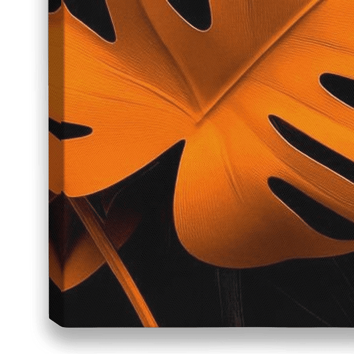 Weelderige bladeren in levendig oranje en diepzwart ontvouwen zich in een opwindend spel van licht en schaduw. Deze harmonieuze combinatie prikkelt de zintuigen en doet denken aan tropische oases. De opvallende vormen van de bladeren geven het geheel een dynamische energie die zowel rust als opwinding uitstraalt.