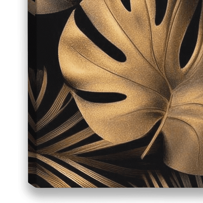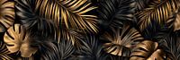 Een weelderige zee van bladeren ontvouwt zich, met rijke, gouden accenten die tevoorschijn komen uit een mysterieuze, donkere achtergrond. De stijlvolle, filigrane bladeren stralen exotische flair uit en nodigen je uit om je onder te dompelen in een wereld van tropische elegantie. Een harmonieus spel van licht en schaduw creëert een…