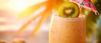 Een verfrissend drankje in felle kleuren, versierd met een parasolletje en een kiwi, roept onmiddellijk vakantiegevoelens op. Het zachte licht dat door de palmbomen schijnt doet denken aan tropische stranddagen. Ideaal voor de keuken of woonkamer, het creëert een vrolijke sfeer en nodigt uit om te dromen van de zomer en zonneschijn.