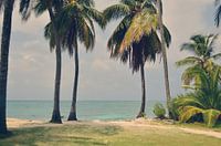 Een paar palmbomen bij de turquoise zee, op een Colombiaans eiland. Een vredige tropische sfeer die ontspanning oproept, met zachte kleuren.