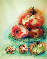 Aquarel tekening van tropische fruit op een glazen schaal. Zachte kleuren in roze rood , groen en blauw.