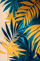 Er ontvouwt zich een tropisch kleurenspel waar diepgroene bladeren en felgeel elkaar ontmoeten. De gebogen contouren van de planten lijken te dansen en geven het beeld een levendige dynamiek. Een harmonieus samenspel van natuur en kunst dat de kijker meeneemt naar een verfrissende oase.