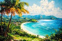 Dit schilderij vangt de essentie van een tropisch paradijs. Met een weids uitzicht over een kristalheldere baai, omlijst door weelderige groene heuvels en majestueuze palmbomen, straalt het een serene, vakantieachtige sfeer uit. De levendige kleuren en het gebruik van impressionistische penseelstreken brengen de scène tot leven, waardoor je bijna de zon op je huid en het zachte ruisen van de golven kunt voelen. Perfect voor elke ruimte die behoefte heeft aan een warme, ontspannende uitstraling, brengt dit kunstwerk een vleugje natuurlijke pracht en rust in je interieur.