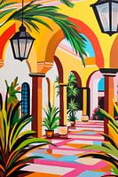 Een levendige plek vol kleuren en vormen voert de kijker mee naar een tropische oase. Warme gele tinten stralen van de muren, terwijl nostalgisch vormgegeven lampen de weg verlichten. Weelderige planten omlijsten de schaduwrijke bogen en de geplaveide vloer leidt mysterieus in de verte. Een perfect toevluchtsoord vol zuidelijke flair!