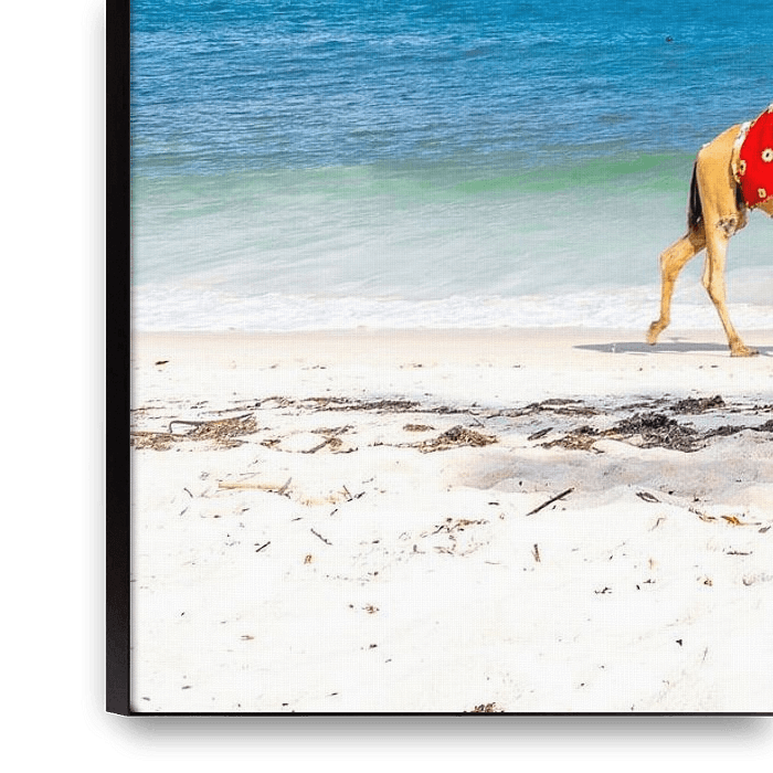 Koop de foto Tropisch wit strand met azuurblauwe zee en blauwe lucht en kamelen van Steven World Traveller als print op canvas, aluminium dibond, (ingelijste) fotoprint, behang en ArtFrame. Voor jou op maat geprint in Fine-Art kwaliteit.