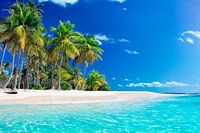 Tropisch wit strand met palmbomen, en een heldere blauwe zee.