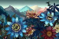 Een betoverend digitaal kunstwerk waar weelderige passieflora's in intense blauwtinten domineren tegen een achtergrond van mistige bergen. De compositie combineert realistische botanische details met een dromerige, bijna surreële berglandschap-setting, waarbij warme roze en rode bloemen voor een harmonieus contrast zorgen.