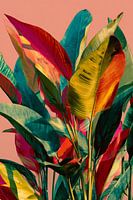 Deze opvallende compositie toont een weelderige verzameling tropische bladeren in een explosie van levendige kleuren zoals turkoois, karmijnrood, okergeel en smaragdgroen, geplaatst tegen een warme perzikkleurige achtergrond. De grafische benadering en speelse lichtval geven het werk een energieke, moderne uitstraling. Ideaal voor interieurs die durven met kleur, en perfect als statement piece in een eigentijds, eclectisch of artistiek decor.