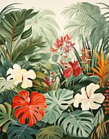 Een tropische plantenopstelling op een oude vintage papieren illustratie, uitgevoerd in de stijl van kleurrijke pixelkunst. Het beeld toont een delicaat ontwerp van bloemen en tuinelementen, met levendige acrylkleuren die de illustratie tot leven brengen. Het geheel roept een sfeer op van een levendig en gedetailleerd kunstwerk, geschikt als behang of illustratie.
