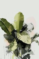De schilder heeft een speelse benadering gebruikt door delen van de bladeren abstract te maken met grove penseelstreken en subtiele kleurvervagingen, wat een contrast creëert tussen realisme en abstractie. Dit zorgt voor een dynamisch beeld waarbij de grenzen tussen de werkelijkheid van de bladeren en de artistieke interpretatie vervagen. Achter de bladeren zijn subtiele hints van roze en beige zichtbaar, wat de groene tinten complimenteert en een zachte achtergrond creëert die de bladeren naar voren brengt.