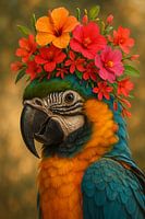 Een kleurrijk schilderij van een papegaai met een vrolijke bloemenkrans op zijn hoofd. Het kunstwerk straalt exotische warmte uit en brengt een tropische sfeer in elke ruimte.