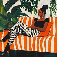 In Tropische Reflectie ontmoeten rust en kracht elkaar in een intieme, kleurrijke scène. Een vrouw zit op een oranje-wit gestreepte bank, haar houding ontspannen maar resoluut, met gekruiste armen en een blik die zowel naar binnen als naar buiten lijkt te kijken. De warme tinten van het interieur contrasteren met het diepe groen van de weelderige planten om haar heen, waardoor een harmonisch spanningsveld ontstaat tussen natuur en moderniteit.