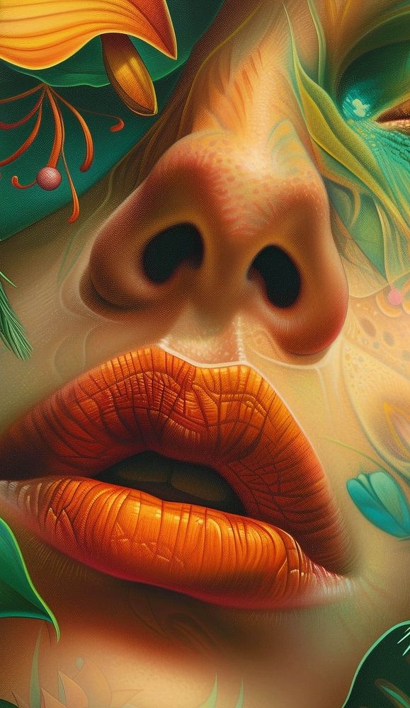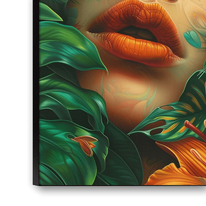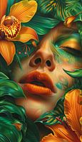 Prachtige vermenging van flora en portret, waarbij het gezicht van een vrouw naadloos opgaat in de weelderige achtergrond van tropische bloemen en bladeren. Het gezicht, centraal in de compositie, wordt gedeeltelijk verborgen door de rijke vegetatie, wat een gevoel van mysterie en eenheid met de natuur suggereert. De kleuren zijn levendig en verzadigd, met een dominantie van groene en oranje tinten die de biodiversiteit van een tropisch regenwoud oproepen.