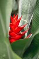 "Tropische Verleiding" legt de exotische schoonheid van een Heliconia bloem vast, een symbool van tropische paradijzen, genesteld tussen het weelderige groen van haar natuurlijke habitat. De vurige rode bloembladen stralen met een bijna onwerkelijke intensiteit, hun scherpe contouren tekenen zich af tegen de zachte lijnen van de omliggende bladeren. Deze foto illustreert de pure kracht en levenslust van tropische flora, een perfecte weerspiegeling van de passie en het avontuur dat men vaak associeert met de diepe jungle. Een beeldschoon stuk voor iedereen die een stukje tropische warmte en exotisme in huis wil halen.