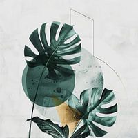 Dit kunstwerk toont een levendige compositie van tropische bladeren in een moderne stijl. De grote, opvallende monsterabladeren harmoniëren met andere tropische planten en creëren een weelderige en exotische sfeer. De groene en blauwe tinten van de bladeren contrasteren met de geometrische vormen op de achtergrond en geven het kunstwerk een eigentijds tintje. Dit kunstwerk is perfect voor liefhebbers van tropische planten en moderne kunst en brengt een vleugje exotiek in elke kamer.