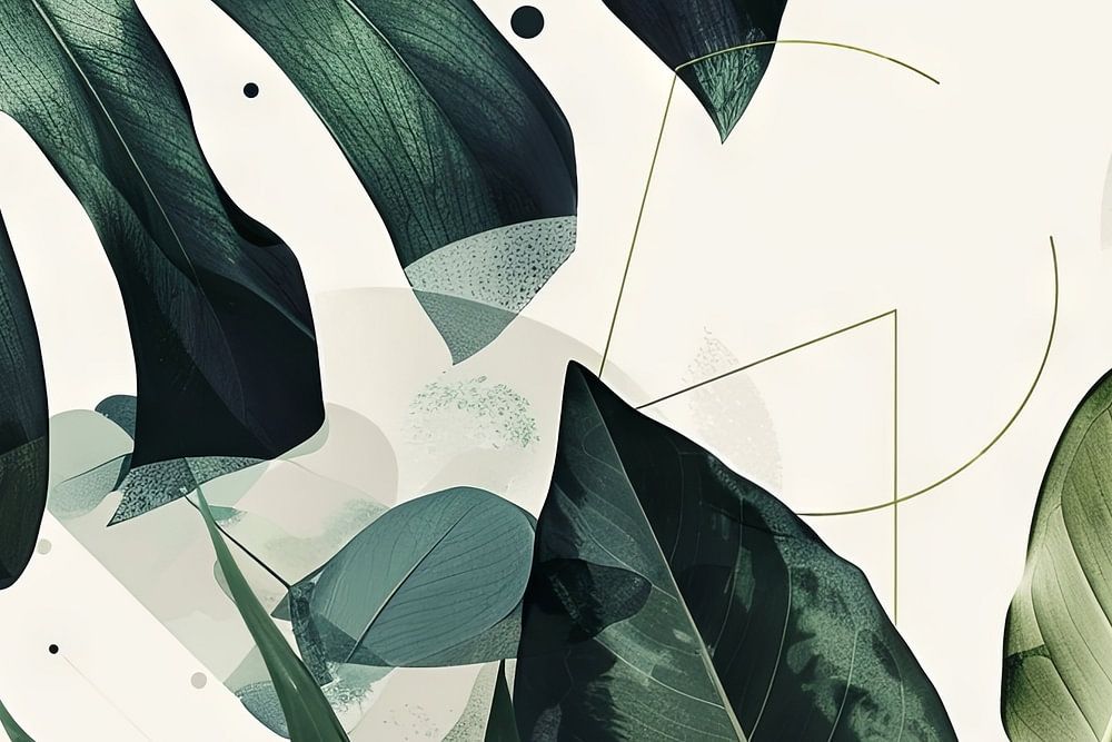 Dit kunstwerk toont een levendige compositie van tropische bladeren in een moderne stijl. De grote, opvallende monsterabladeren harmoniëren met andere tropische planten en creëren een weelderige en exotische sfeer. De groene en blauwe tinten van de bladeren contrasteren met de geometrische vormen op de achtergrond en geven het kunstwerk een eigentijds tintje. Dit kunstwerk is perfect voor liefhebbers van tropische planten en moderne kunst en brengt een vleugje exotiek in elke kamer.