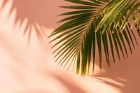 Zachte, groene palmbladeren strekken zich elegant uit over een warme, roze achtergrond, terwijl delicate schaduwen een spel van licht en vormen creëren. De harmonieuze combinatie van natuur en kleur straalt een gevoel van tropische lichtheid en serene elegantie uit die de kamer vult met kalmte en frisheid.