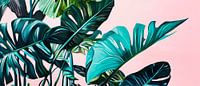 De weelderige, tropische bladeren in rijk groen contrasteren levendig met de delicate roze tint op de achtergrond, waardoor een frisse, levendige sfeer ontstaat. Deze harmonie van natuur en kleur zou perfect passen in een woonkamer, waar het een ontspannen oase vol levensvreugde en stijl creëert. Ideaal voor een groene onderbreking in het dagelijks leven!