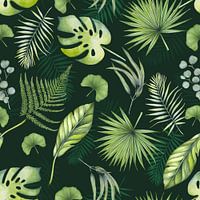 Patroon van tropische bladeren in het groen als patroon op donkergroene achtergrond gemaakt in aquarel.