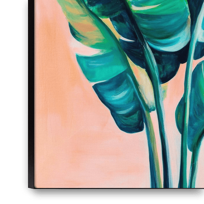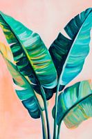 Weelderig en levendig glanzen de tropische bladeren in weelderig groen, kunstig gerangschikt tegen de zachte, warme achtergrond. Hun gebogen vormen en fijne details geven het werk een zekere elegantie en levendigheid. Een vleugje exotisme doordringt het tafereel, terwijl de harmonieuze kleurencompositie uitnodigt om te dromen.