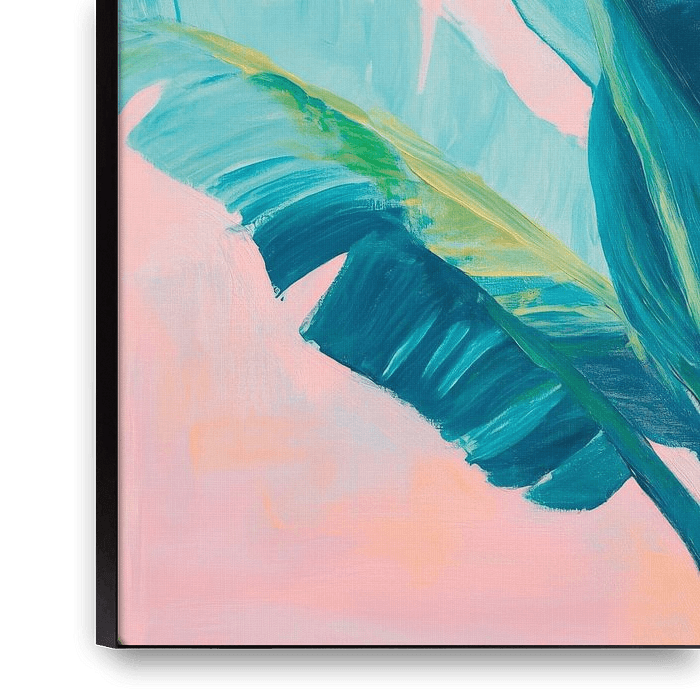 Onder een zachte, harmonieuze roze hemel ontvouwen majestueuze bladeren zich in weelderig groen. De gebogen, elegant gelaagde bladeren lijken bijna op een bewegend gevleugeld wezen. Een gevoel van tropische frisheid en levendigheid doordringt de compositie, die zowel rust als dynamiek belooft.